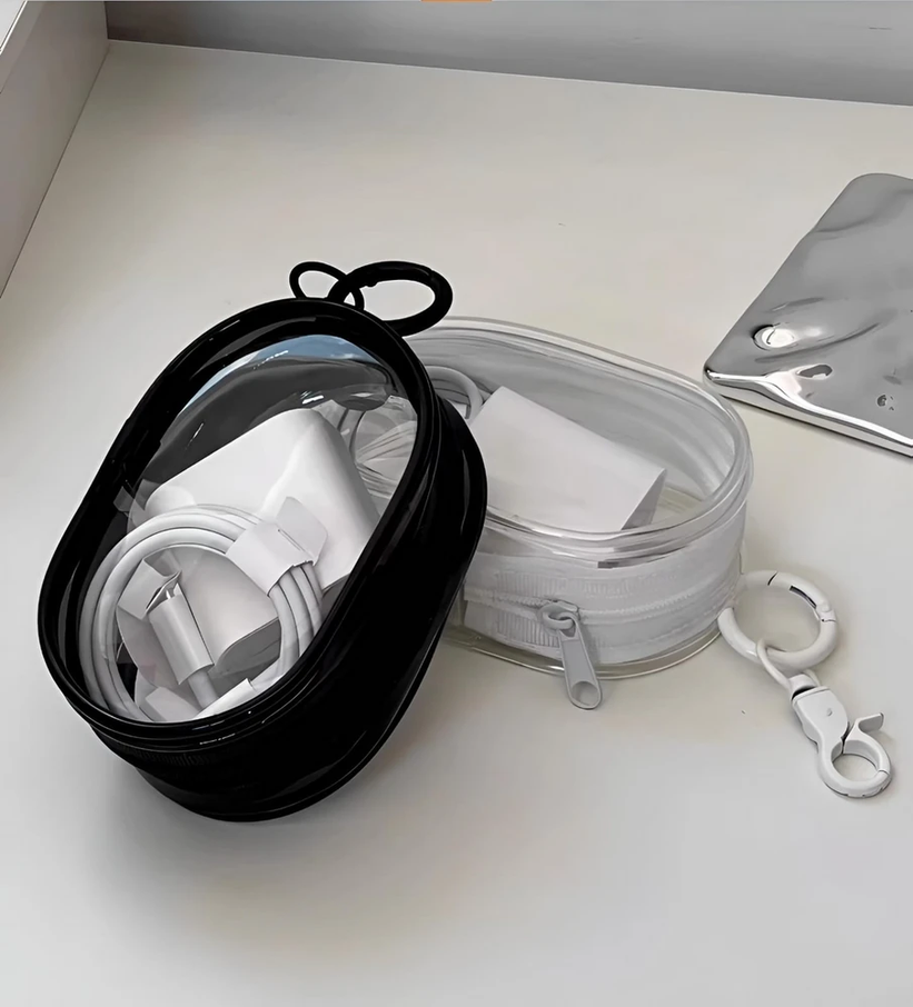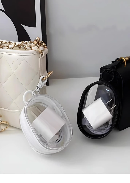 (Mini estuche portátil para cargador de teléfono celular. Cuenta con un compartimento transparente con cierre y un gancho para facilitar su traslado. Ideal para organizar tu bolso).