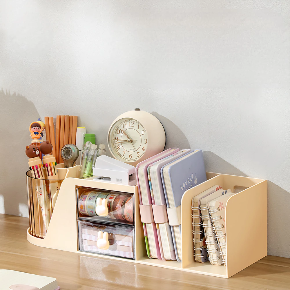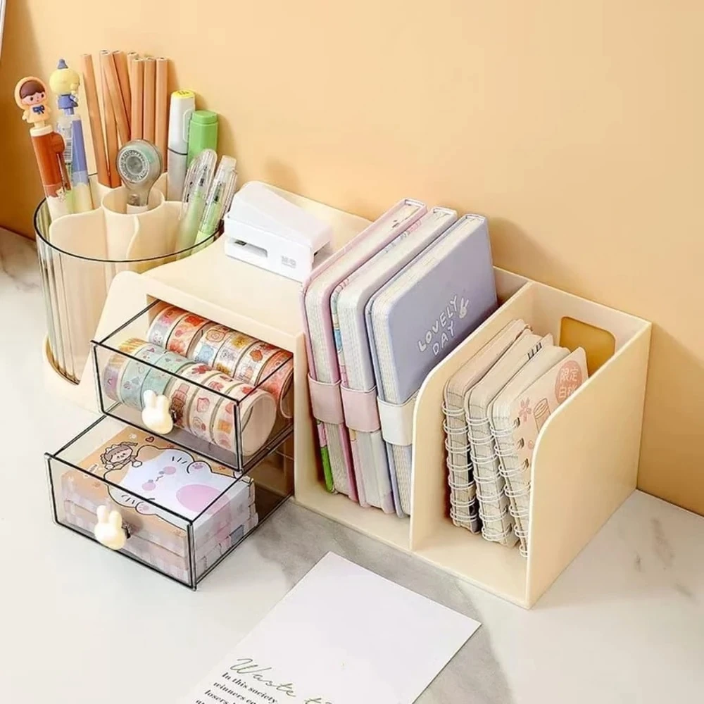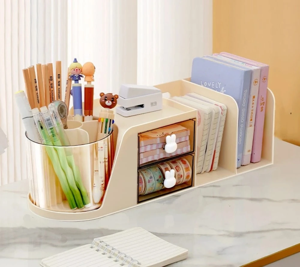 Organizador multiuso color crema que cuenta con dos cajoncitos y tres divisorios, uno de ellos es redondo y se divide también, el cual permite colocar, lápices, brochas o lo que usted elija. Ideal para colocarlo en la habitación, en su escritorio).