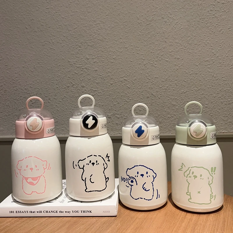 (Botella de acero inoxidable disponible en varios colores con diseño de perrito, cuenta con sorbete, pico y tapa a rosca, fácil de llevar a cualquier lado).