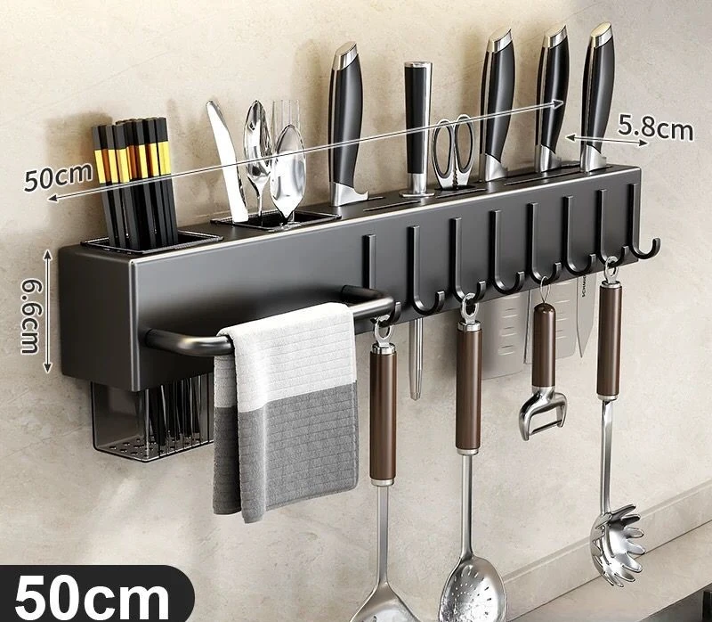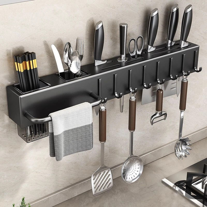 Organizador multiuso con diseño minimalista. Cuenta con 8 ganchos, 2 cubierteros con sistema de drenaje, 7 portacuchillas, un porta tijera, un porta afilador y un soporte para el repasador. Además, posee un manual de instalación con los elementos necesarios para ello (tornillos, tarugos y 2 soportes metálicos). Ideal para organizar tu espacio de cocina).
