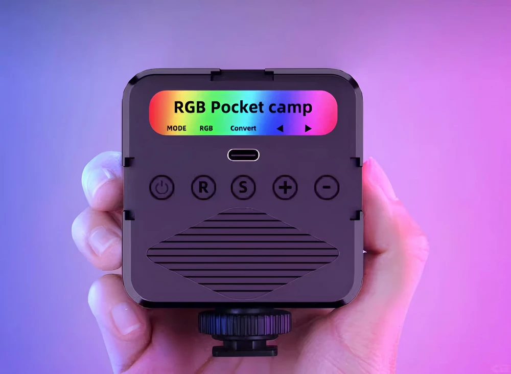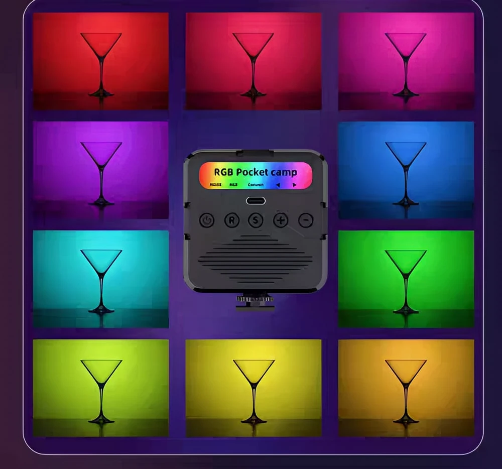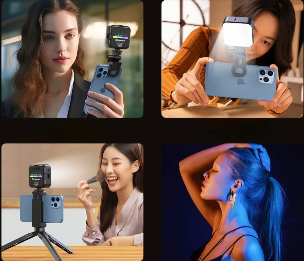 (Luz led para fotografía o videos. Esta se coloca arriba del celular con el soporte que trae, cuenta con varios colores, entre ellos luz cálida y fría, botón para aumentar la intensidad y otro para poner las luces titilantes. Cuenta con cargador USB).