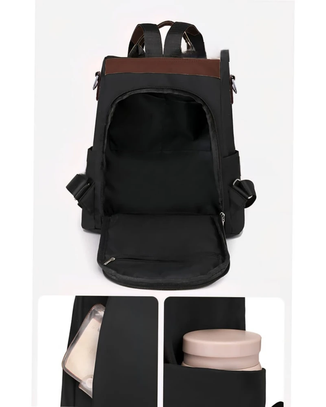 (Cuenta con un compartimiento amplio, tres bolsillos interiores, uno de ellos con cierre, dos bolsillos laterales y un bolsillo frontal con cierre. Permite guardar una variedad de objetos personales como computadoras, teléfonos móviles, carteras, y otros elementos esenciales. Equipada con correas diseñadas para un transporte cómodo).