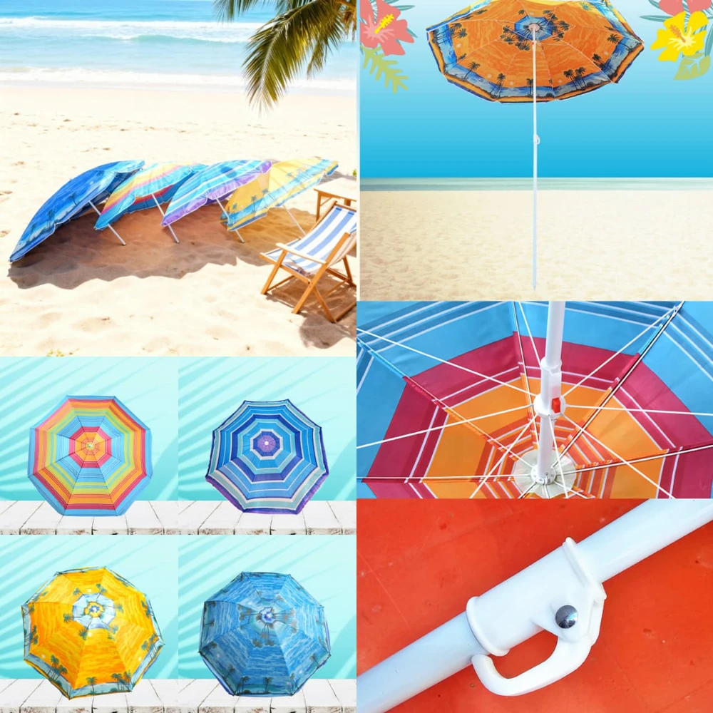 (Sombrilla de poliéster estampado, tiene ancla de arena integrada,8 varillas y su altura es regulable. Diámetro del caño 2.5/1.7 cm).