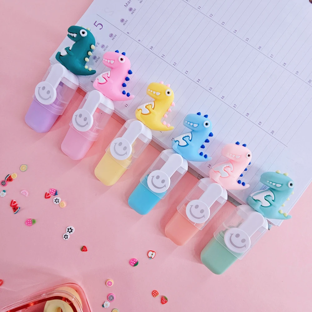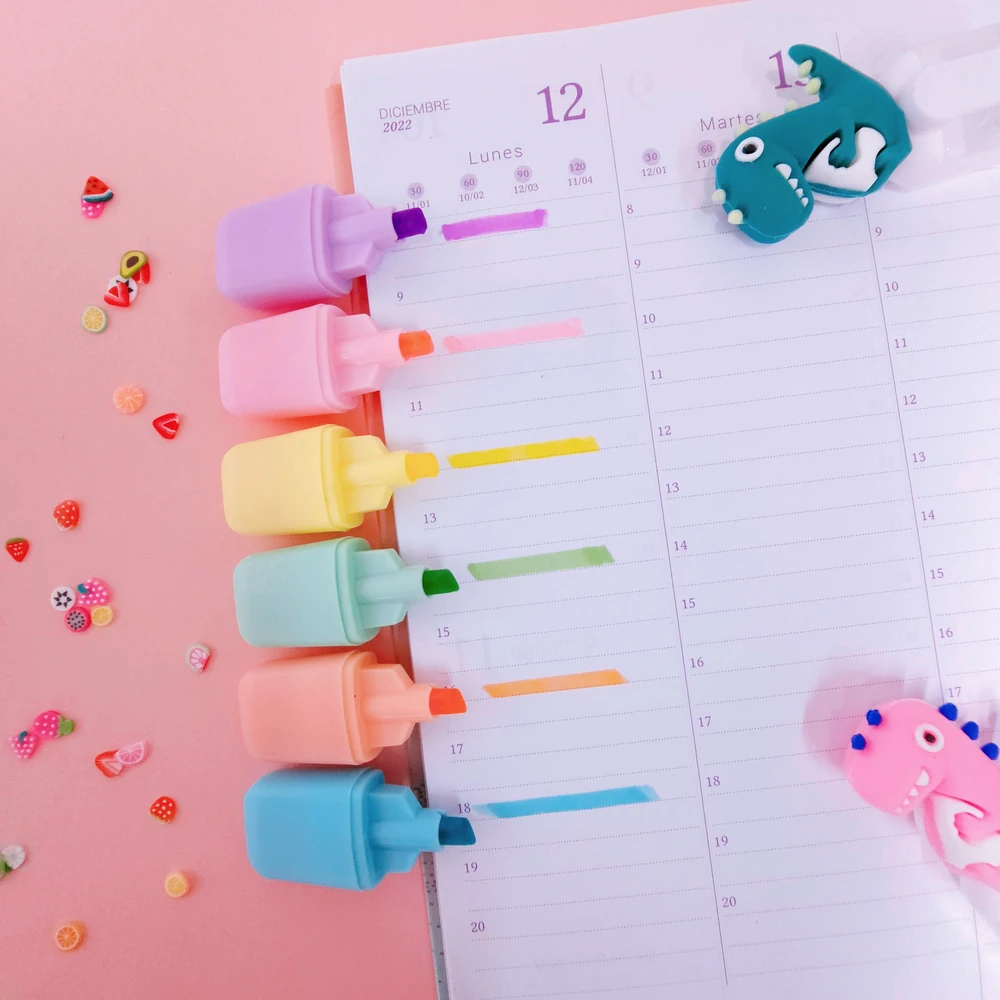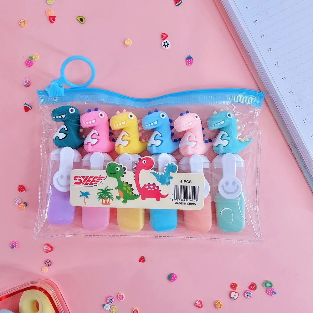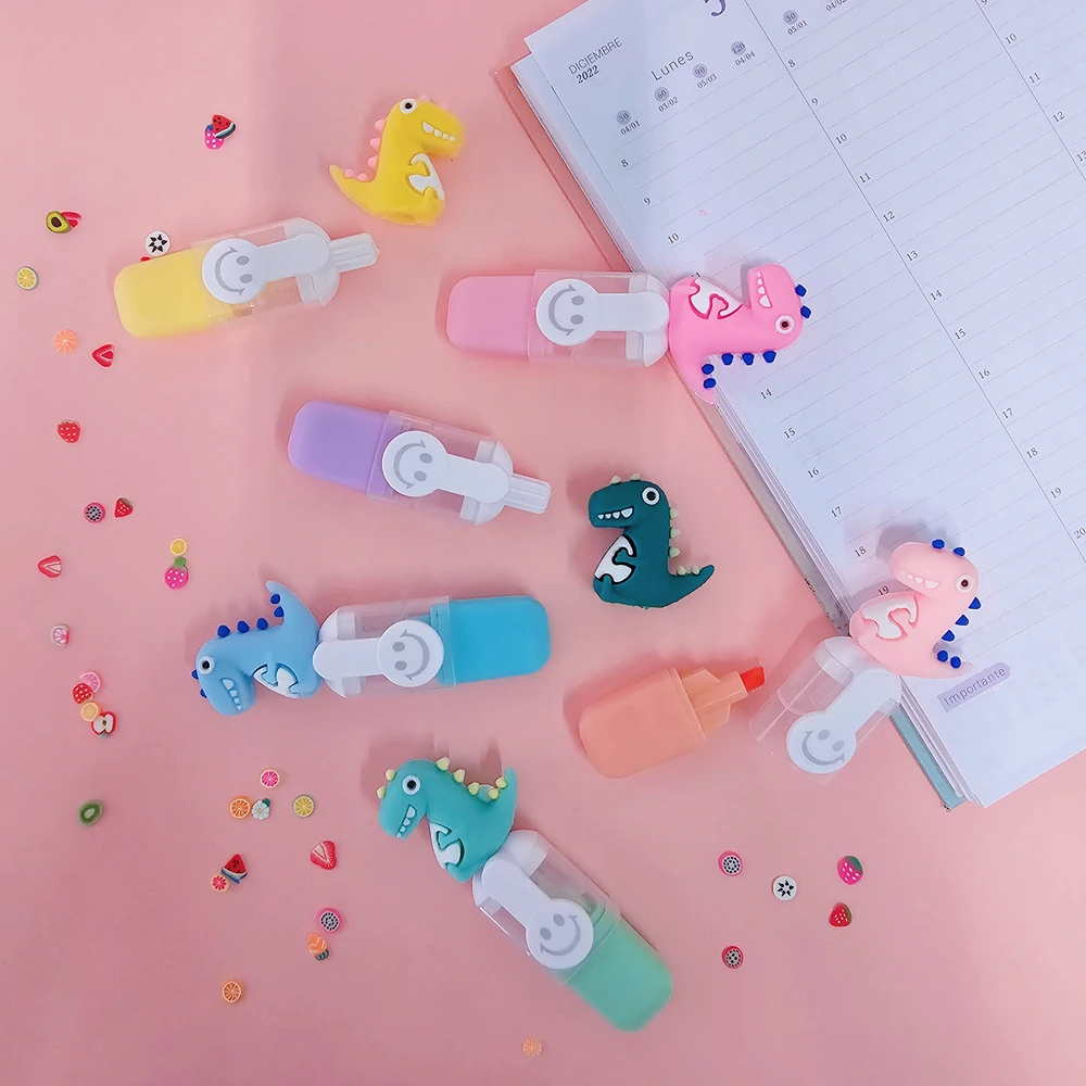 (set por 6 resaltadores mini en tonos pastel como lila,celeste,verde rosa, naranja y amarillo , con una tapa que tiene un muñequito de dinosaurio y estuche hermético )