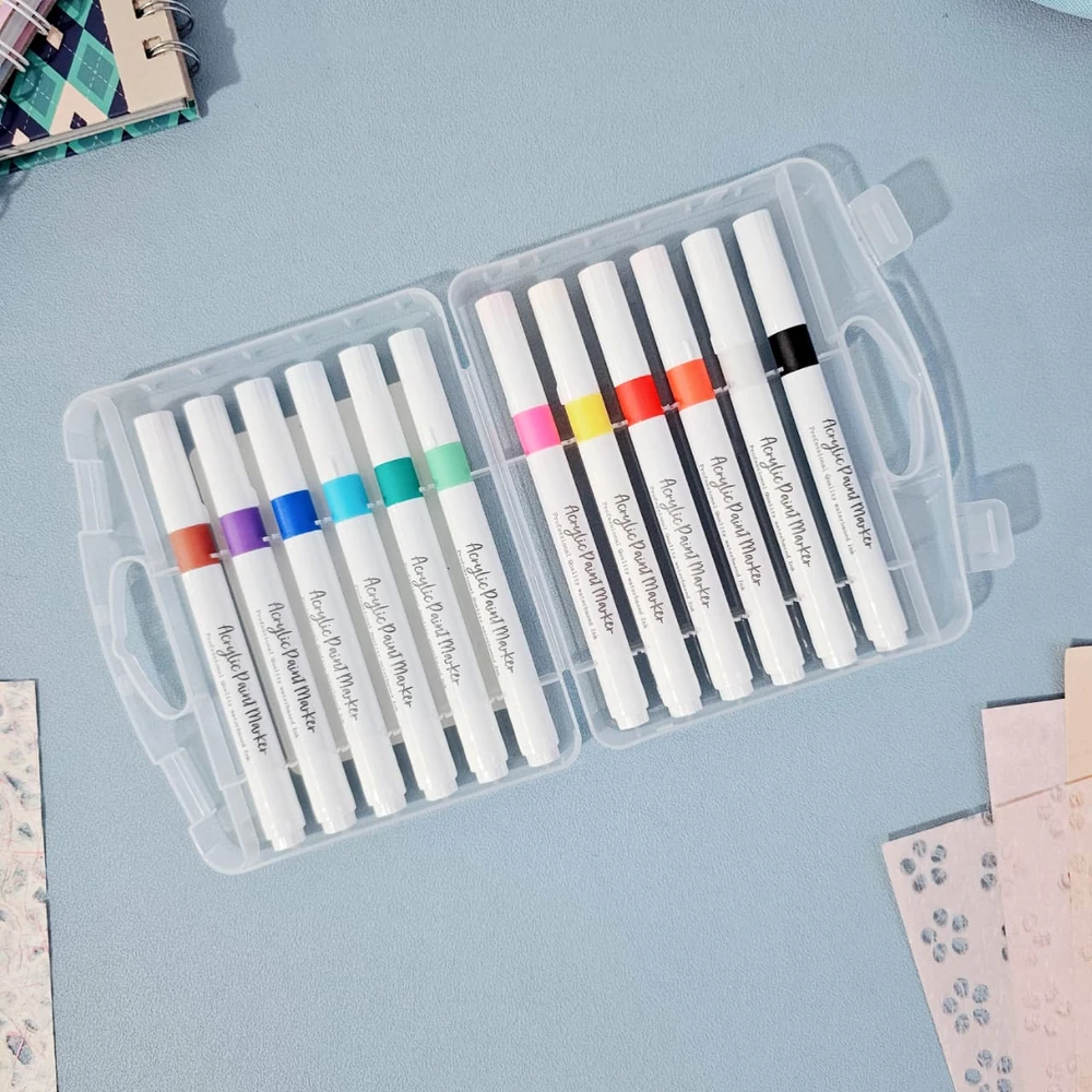 (Set x 12U. tinta acrílica ideal para pintar en vidrio, pared o superficie oscuras como cartulina, etc. Punta tipo pincel ideal para pintar o hacer lettering).