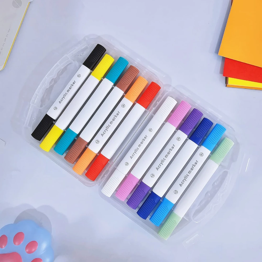 (Estos marcadores contienen pintura acrílica en su interior, lo que les permite pintar sobre casi cualquier superficie, como papel, madera, tela, vidrio y cerámica. tienen doble punta (una fina y una de pincel), lo que los hace versátiles para realizar detalles y rellenar áreas más grandes)