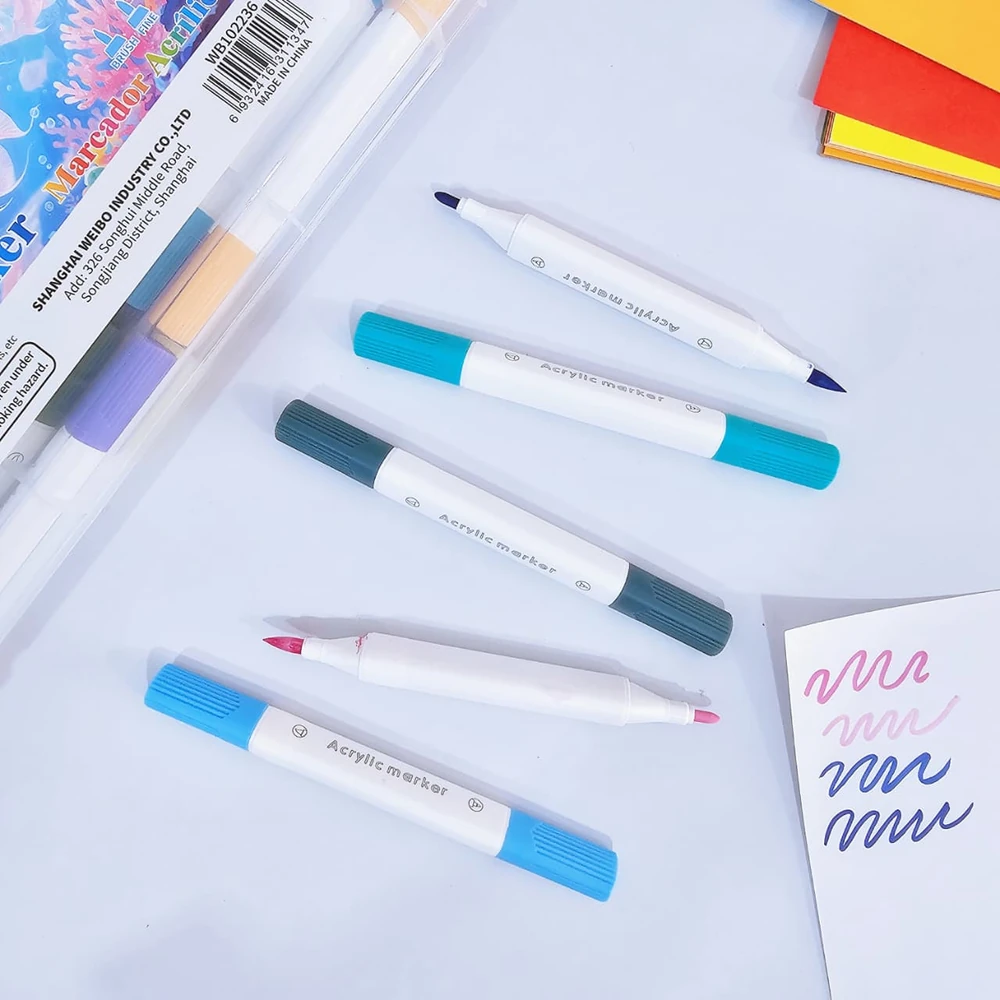 (Estos marcadores contienen pintura acrílica en su interior, lo que les permite pintar sobre casi cualquier superficie, como papel, madera, tela, vidrio y cerámica. tienen doble punta (una fina y una de pincel), lo que los hace versátiles para realizar detalles y rellenar áreas más grandes)