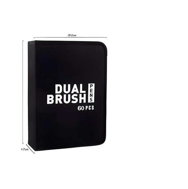 (Marcadores Dual Brush x 60 piezas. Contienen marcadores con doble punta, una es microfibra la otra es punta pincel ideal para lettering; Incluye estuche organizador, ligero y liviano y una amplia gama de colores que no se repiten).