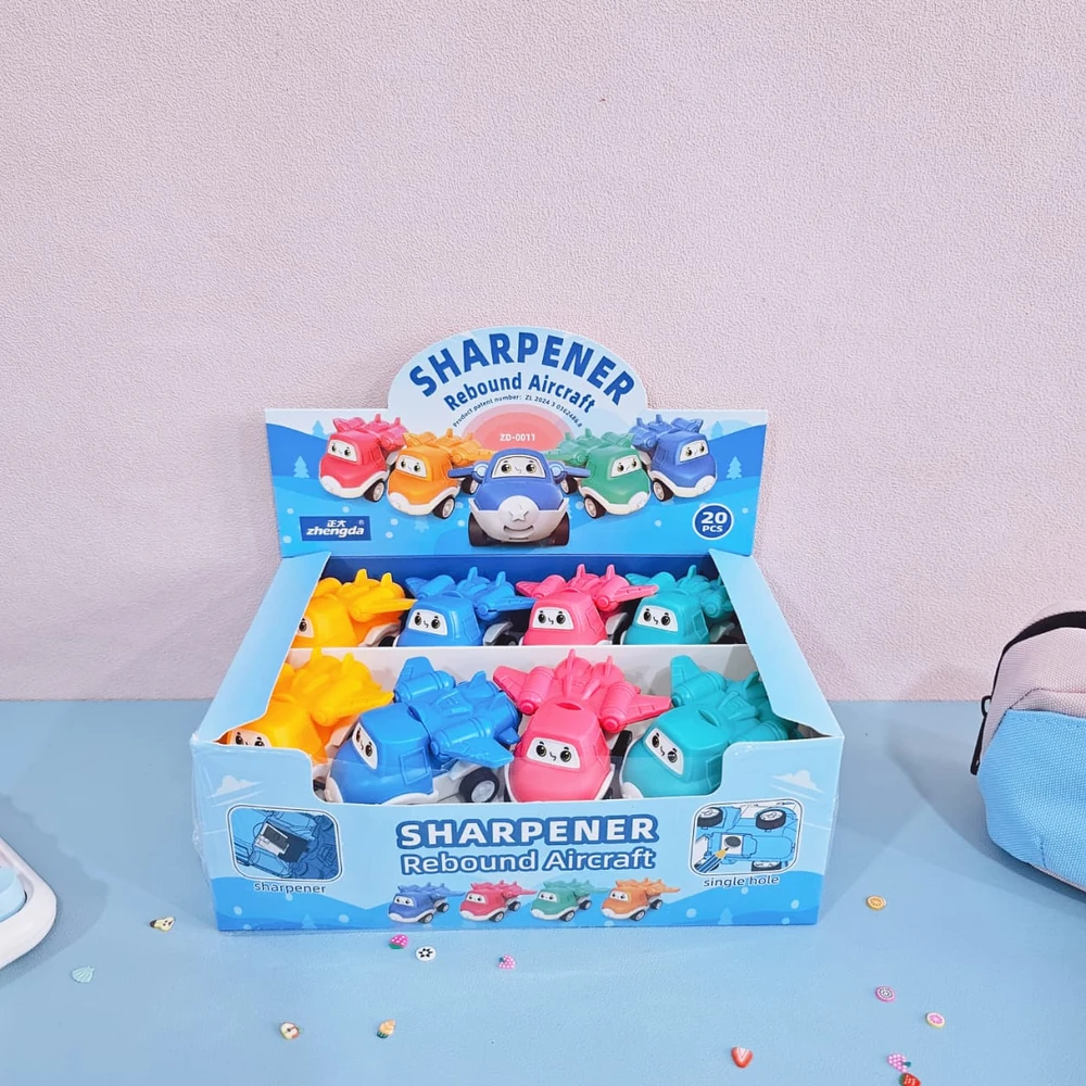 (Caja x 16u. sacapuntas tipo legos con forma de aviones, ideal para darle un toque de diversión a tus útiles, están disponibles en 4 colores: rosa, naranja, azul y verde).