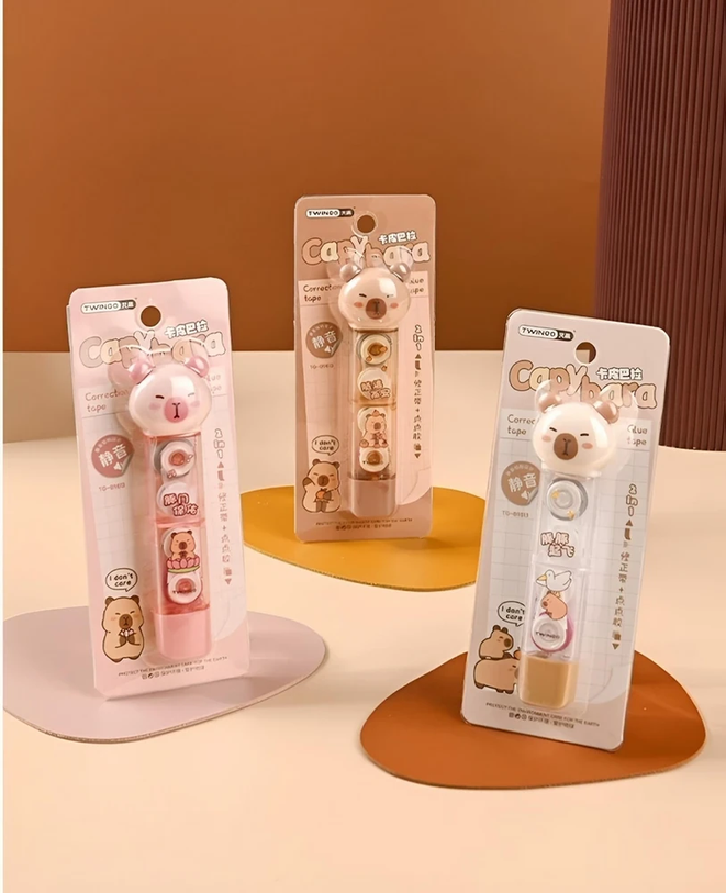 (Este producto cuenta con un tierno diseño de capybara que funciona como cinta de pegar en un extremo y en el otro como cinta correctora. Ideal para regalar).