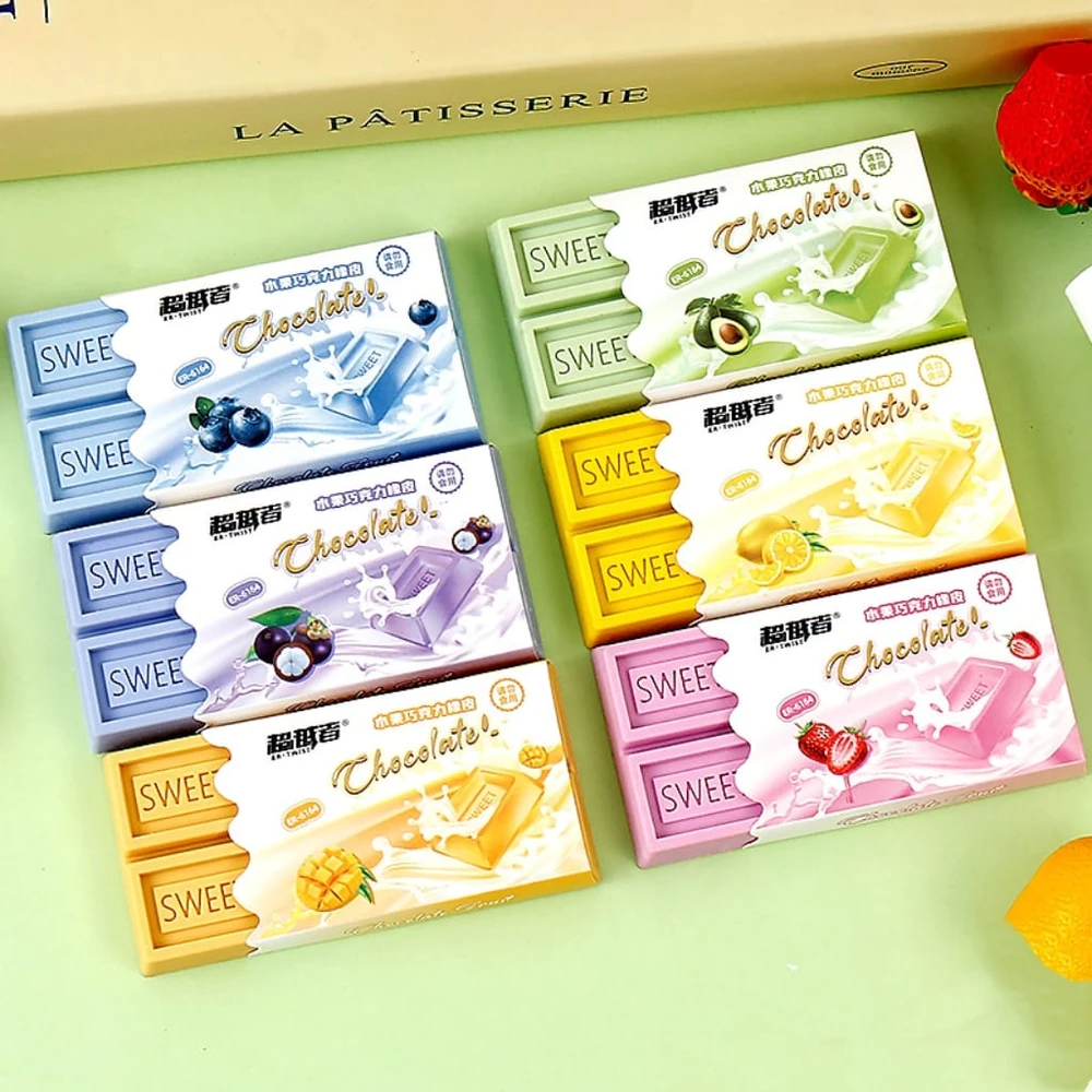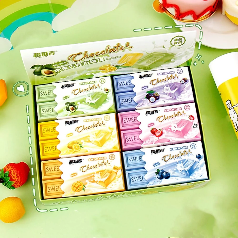 (Caja x 18U. Borradores con forma de chocolate en barra. Vienen 6 modelos de distintos colores. Ideal para regalar).