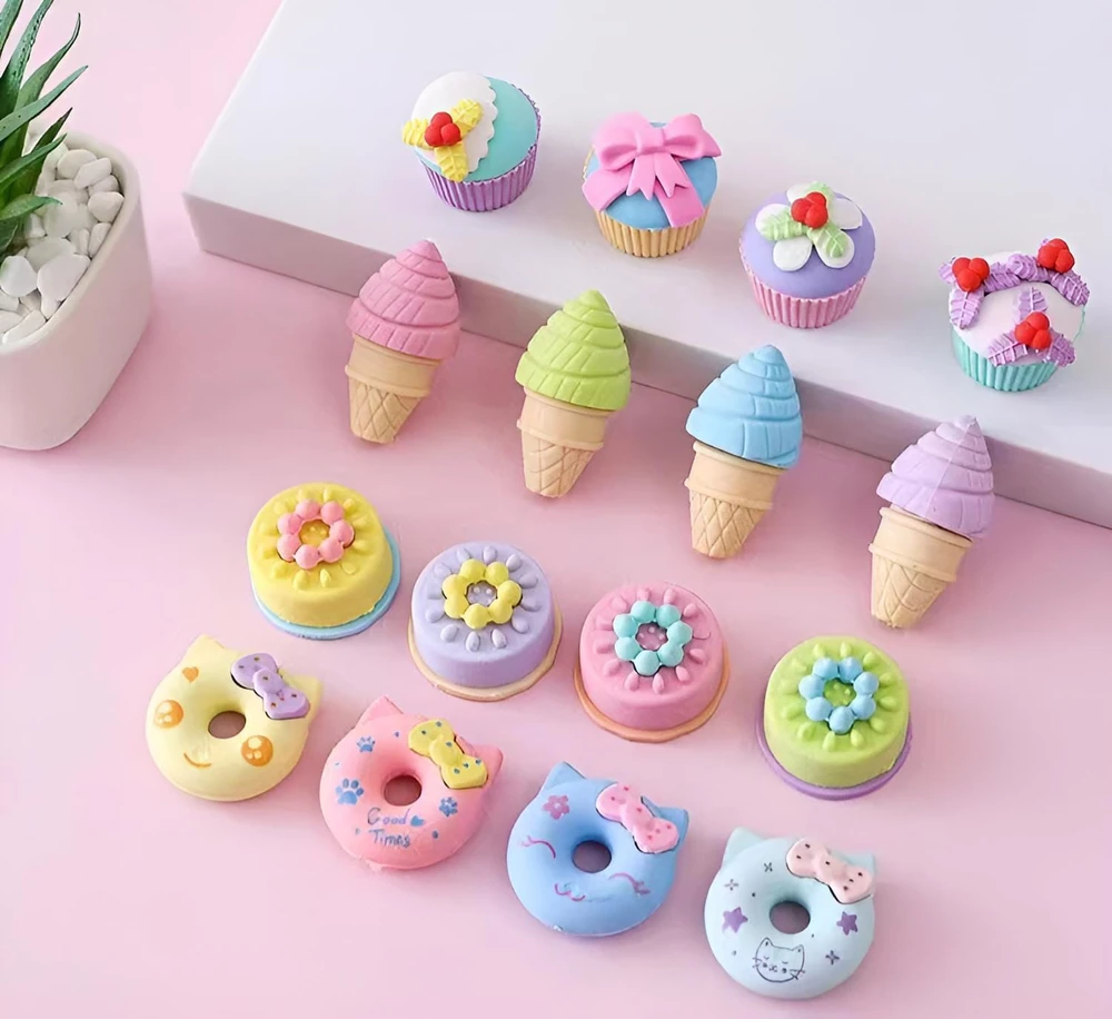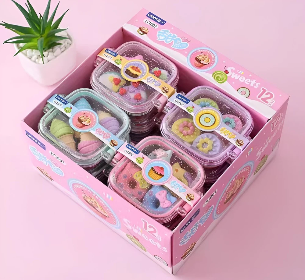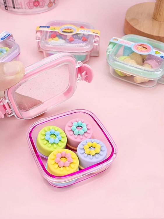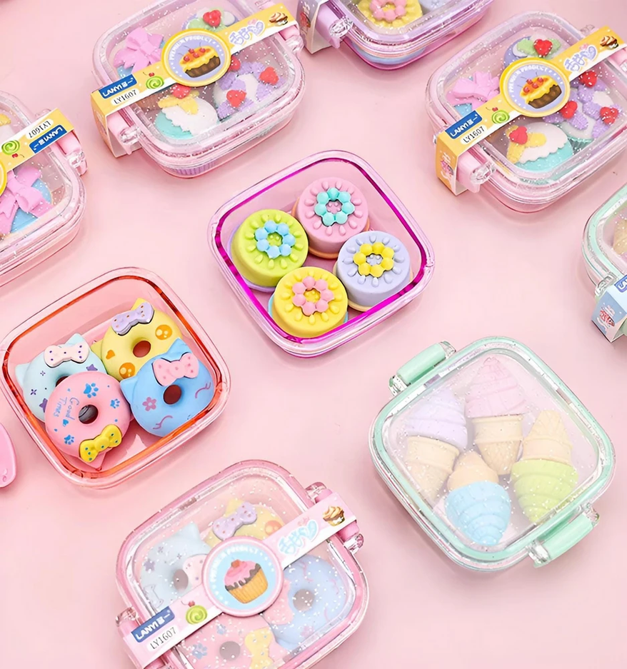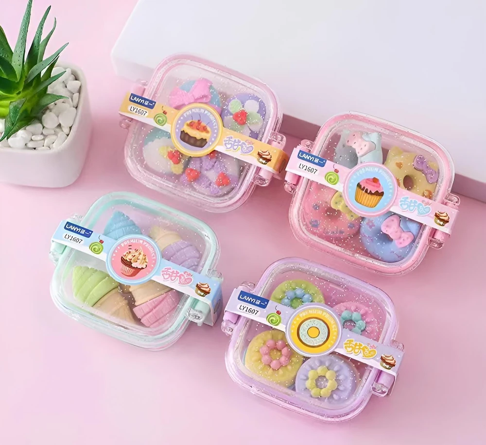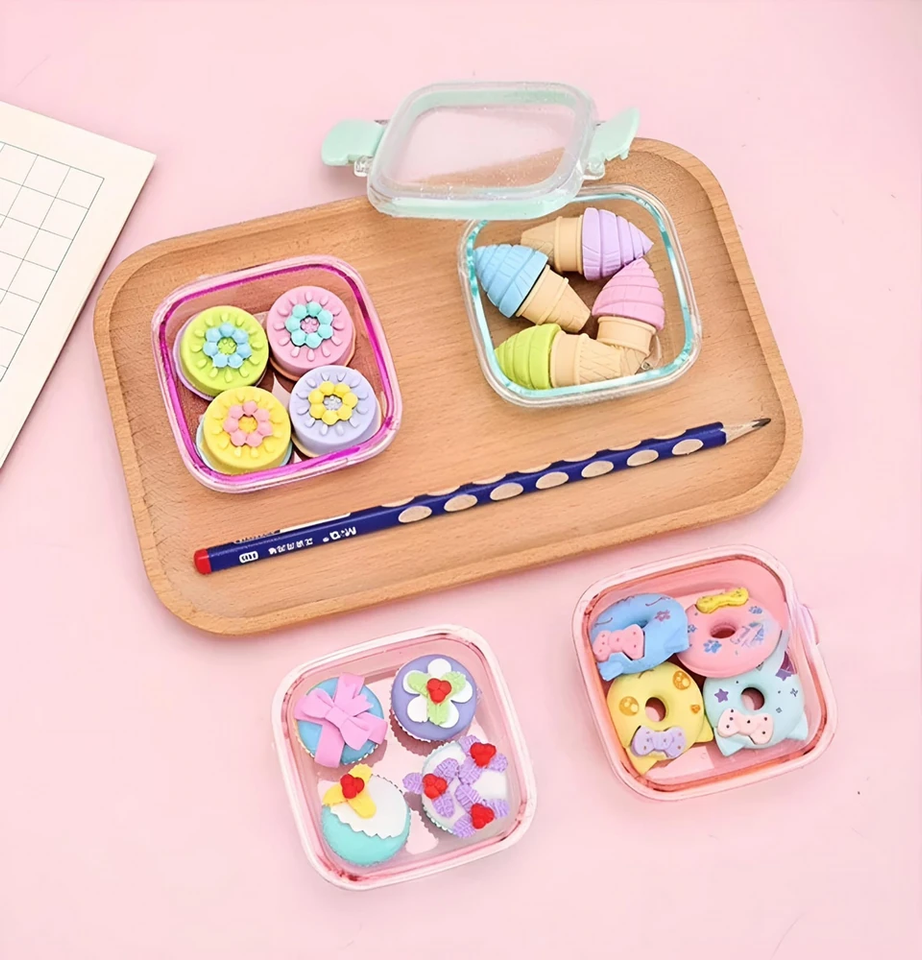 (Cajita de acrílico con 4 Goma de Borrar, diversos diseños como torta, donas, helado, etc.).