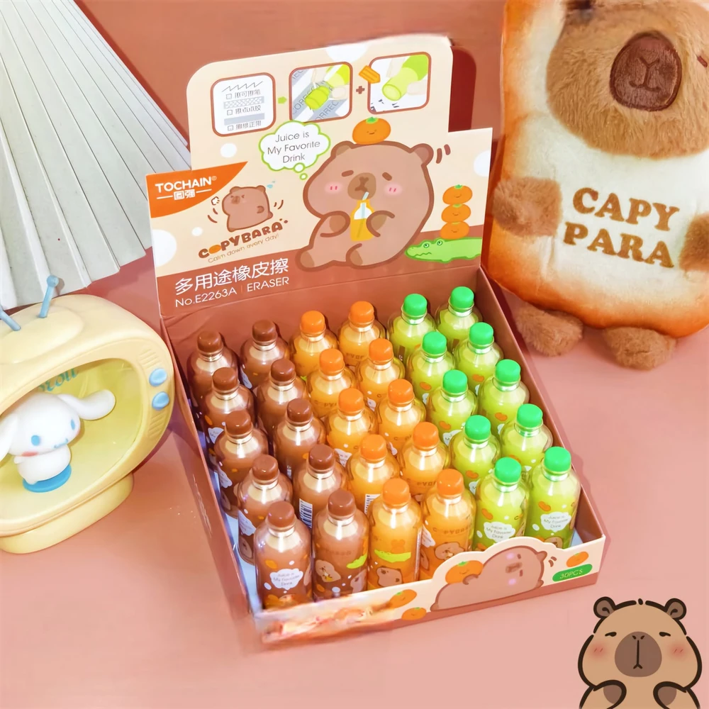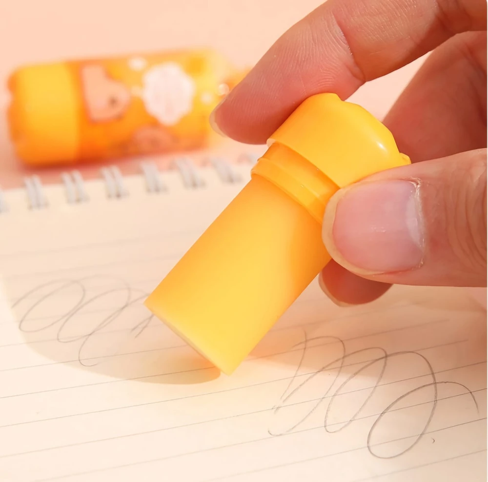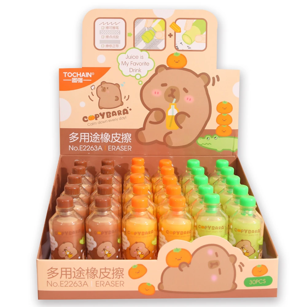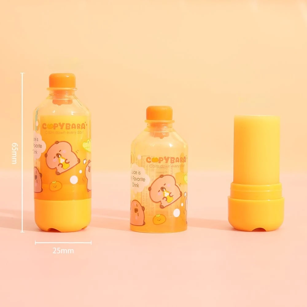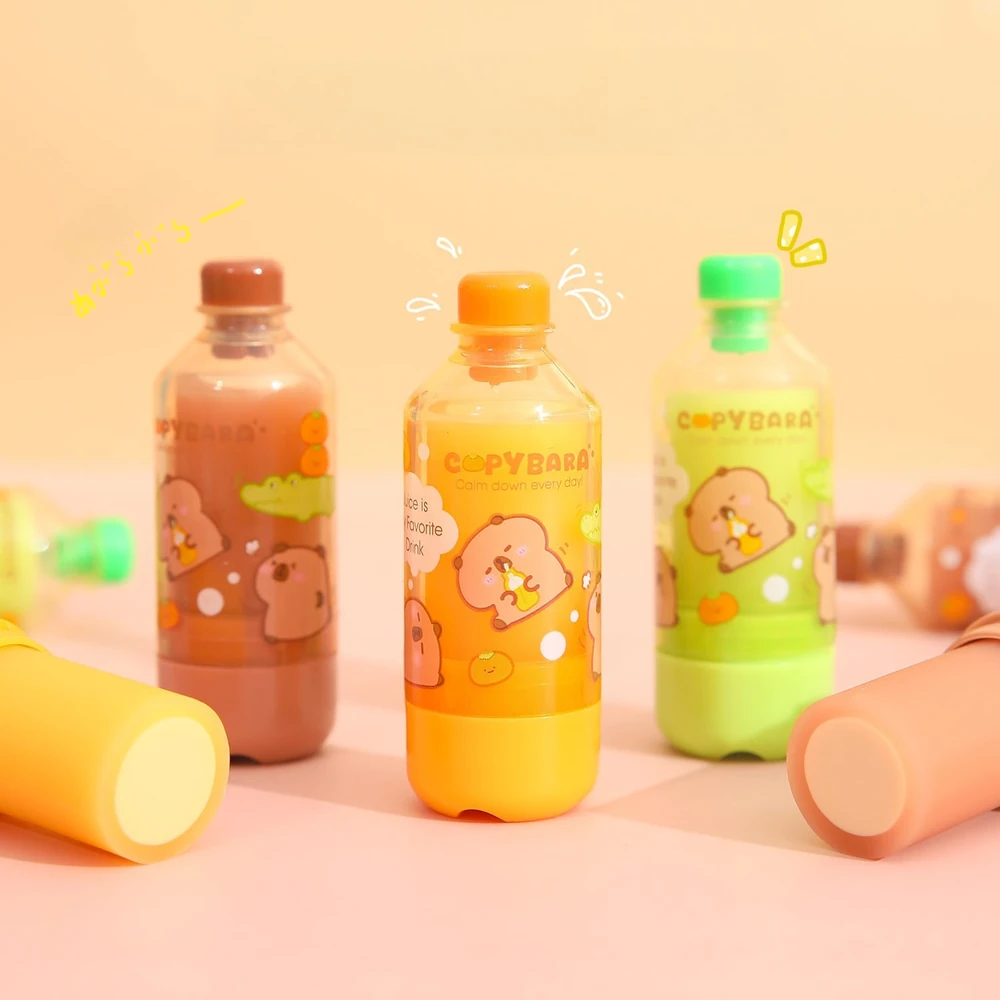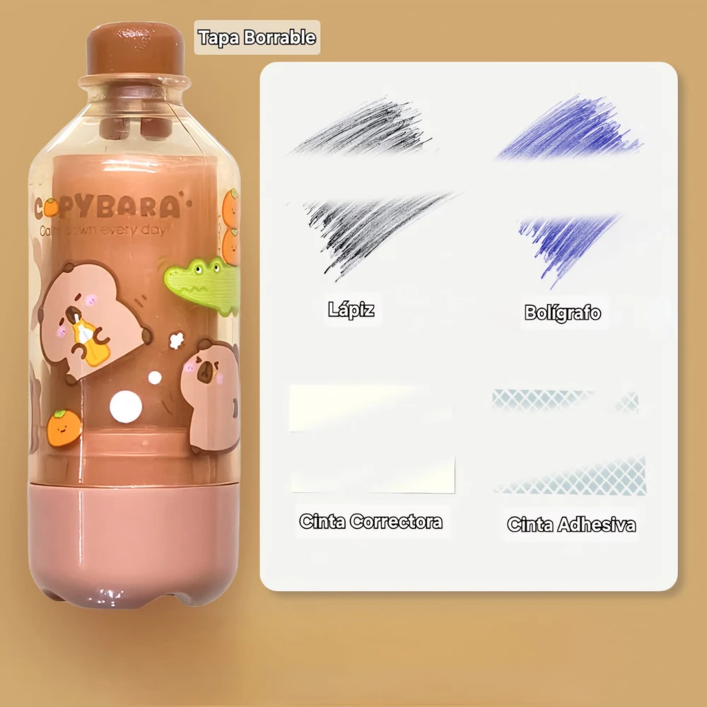 (Goma de borra en forma de botellita con diseño de capybara, cuenta con tapa borrable para borrar cinta correctora y adhesivos. viene en 3 colores. Especial para regalar y le de un poco de entretenimiento a tus utiles).