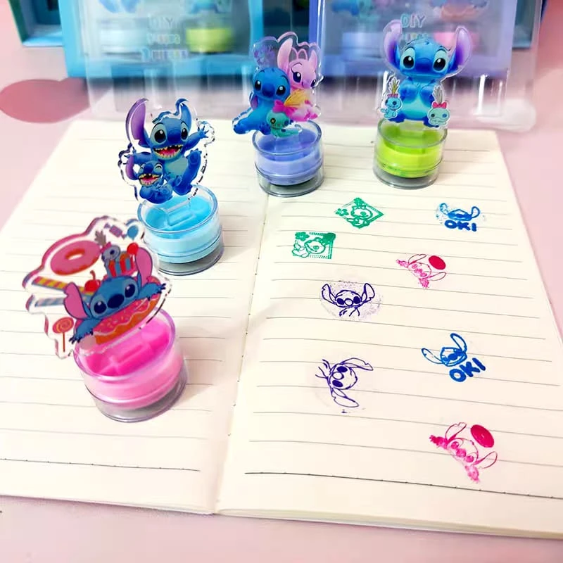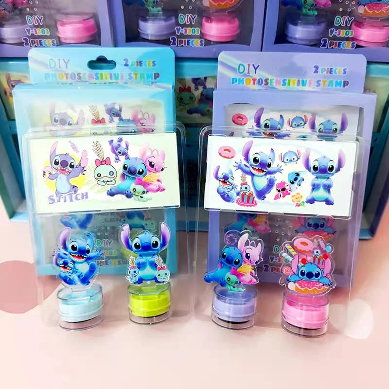 (Cada set cuenta con 2 sellos con temática de "Stitch" y también un anotador. Ideal para uso escolar, Los sellos vienen en 4 colores diferentes: rosa y violeta y el otro set verde y azul).