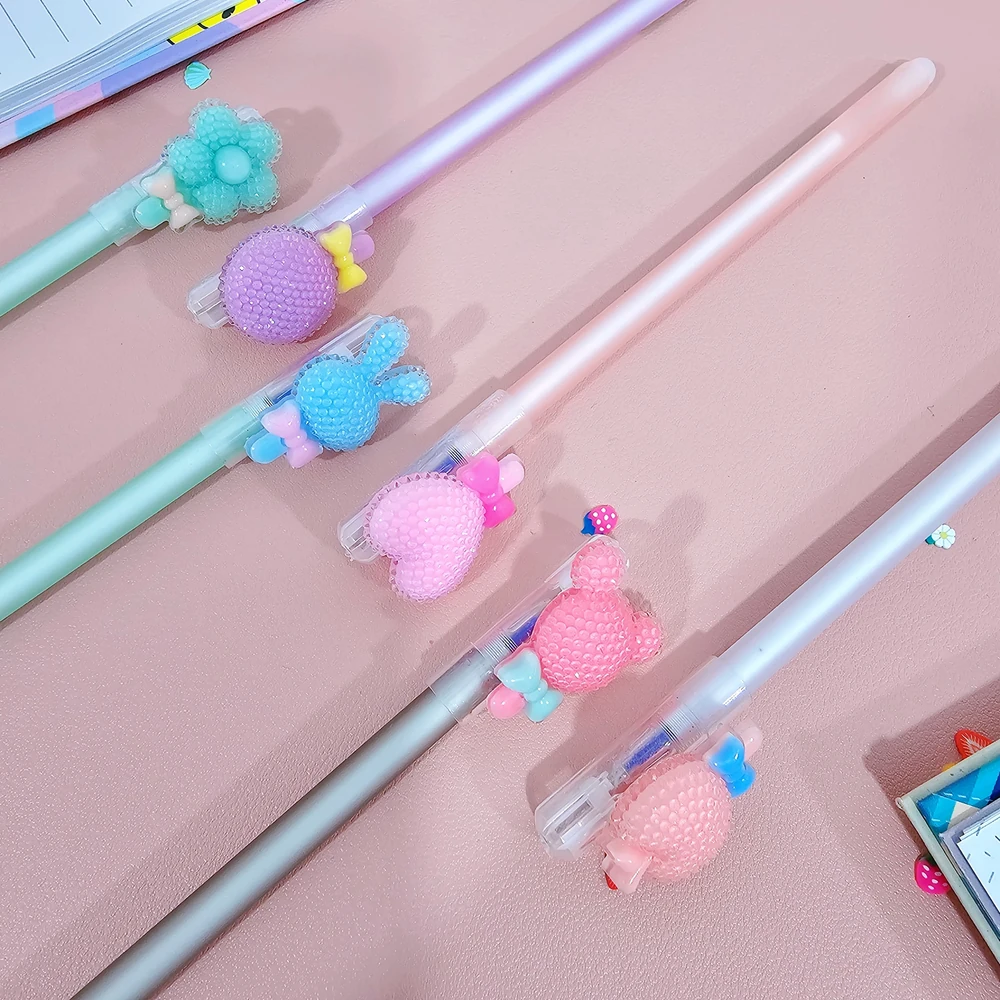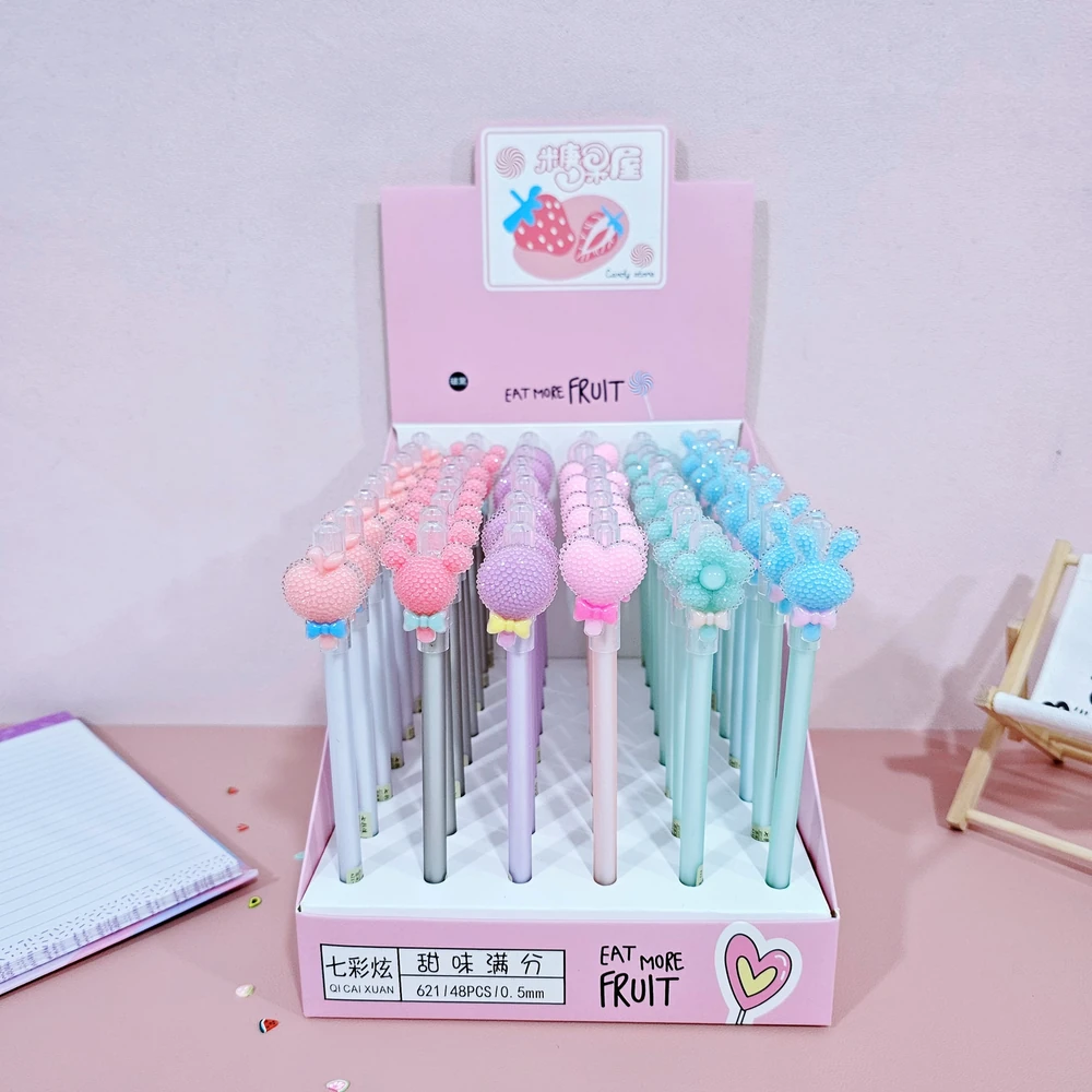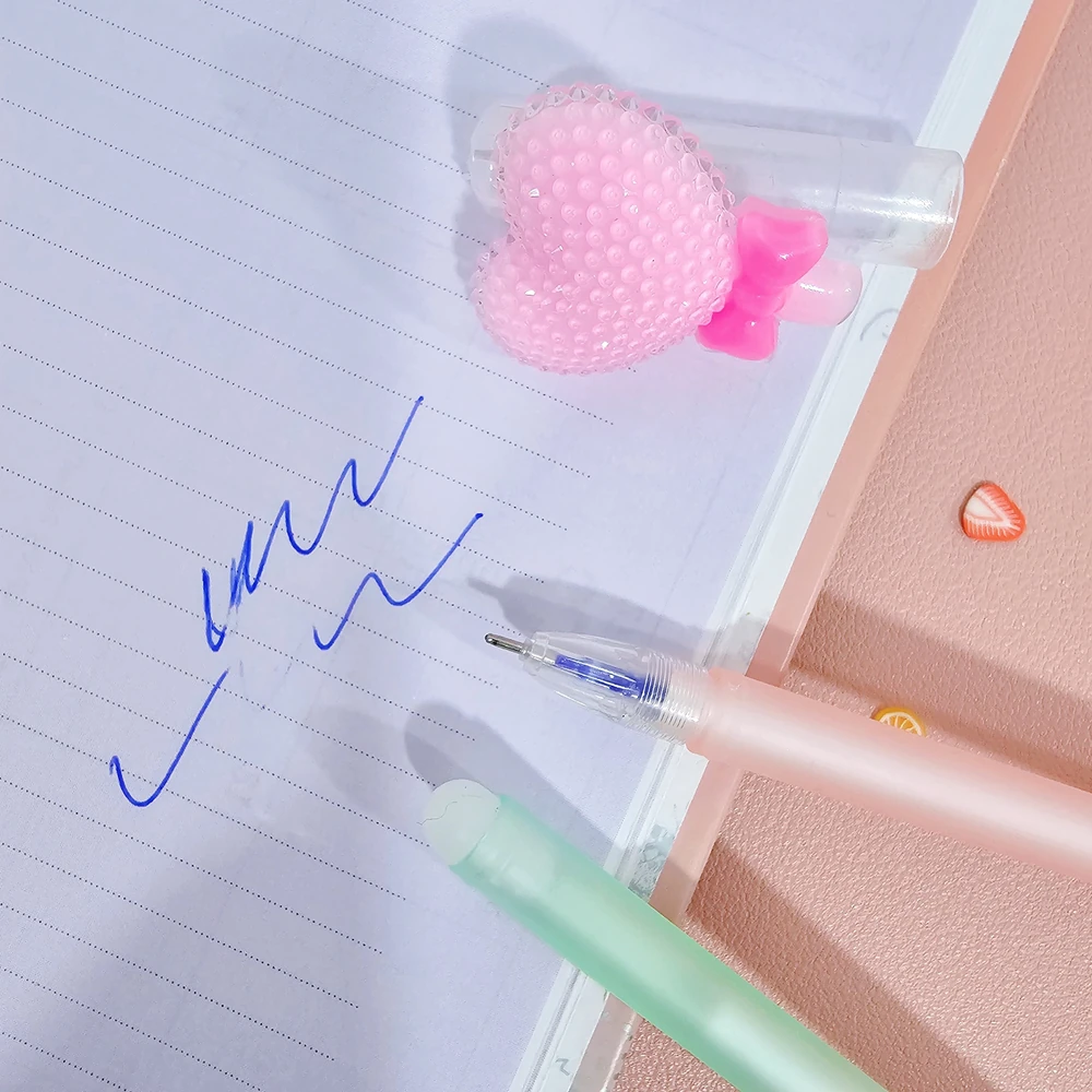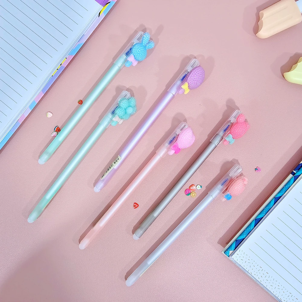 (Caja x 48U. Birome en diferentes colores con tinta azul borrable, Cada una cuenta con un accesorio diferente en su tapa y un goma en su extremo).