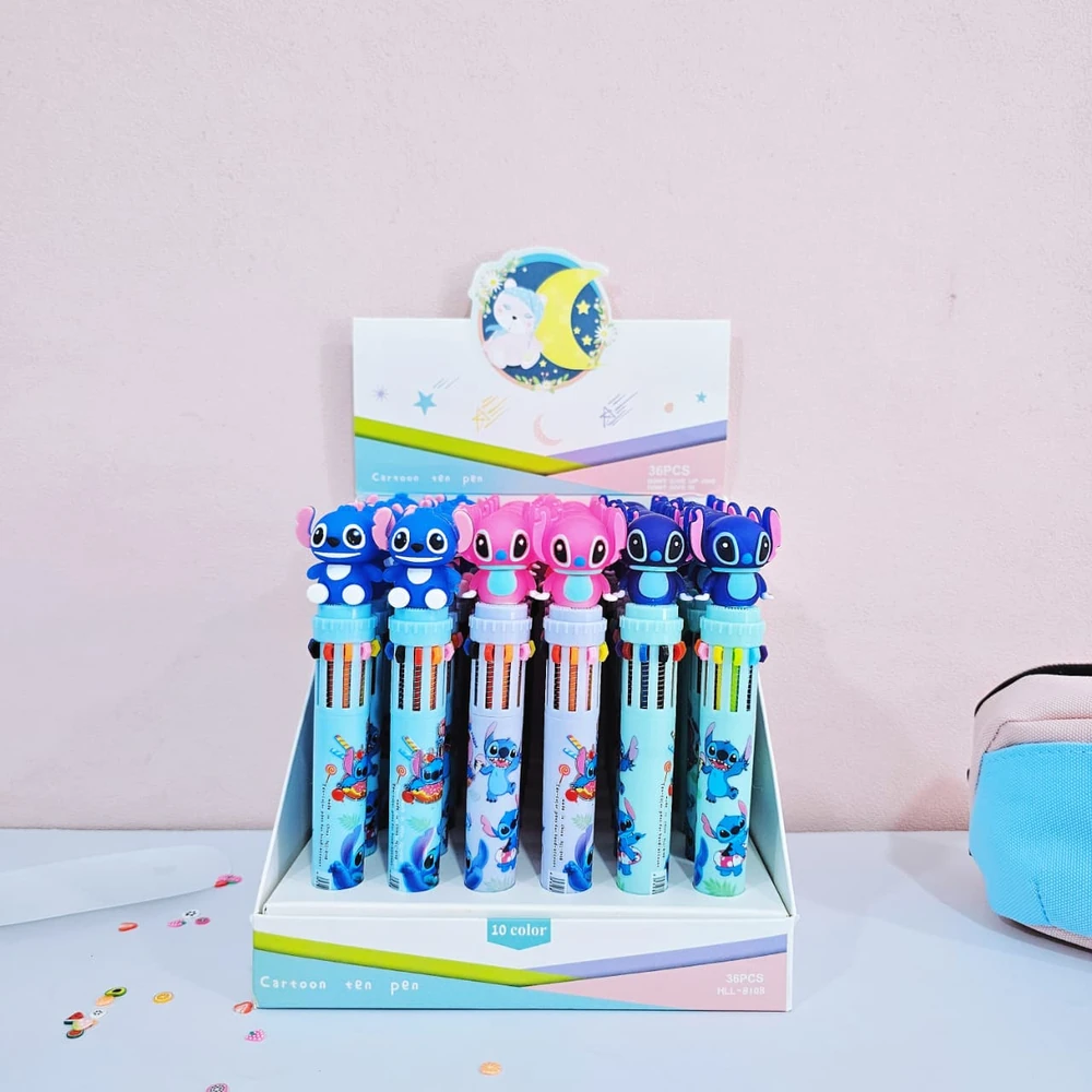 (Lapiceras con divertido diseño de Stitch. Son ideales para anotaciones, dibujos ya que tienen 10 colores de tinta diferentes, Disponible caja x 36 unidades surtidas).
