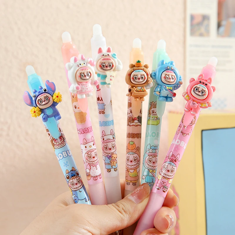 (Caja x 36U. de birome labubu en diferentes diseños , cuenta con un mecanismo retráctil. ideal para poder regalar, llevar al colegio, etc. En una de sus puntas cuenta con un muñequito de labubu).