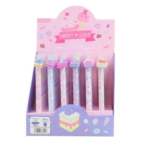 (Lapiceras con tinta azul borrables con temática de postres "Sweet Love". Cada una tiene un diseño divertido y temático de postres, como pasteles y helados. Incluyen gel borrables, lo que permite corregir errores fácilmente. Cuentan con una punta de 0,5 mm que ofrece una escritura suave y precisa. Están fabricados en plástico, lo que garantiza durabilidad y comodidad durante el uso. Son ideales para uso diario en la oficina o la escuela, así como para tomar notas y organizar ideas).