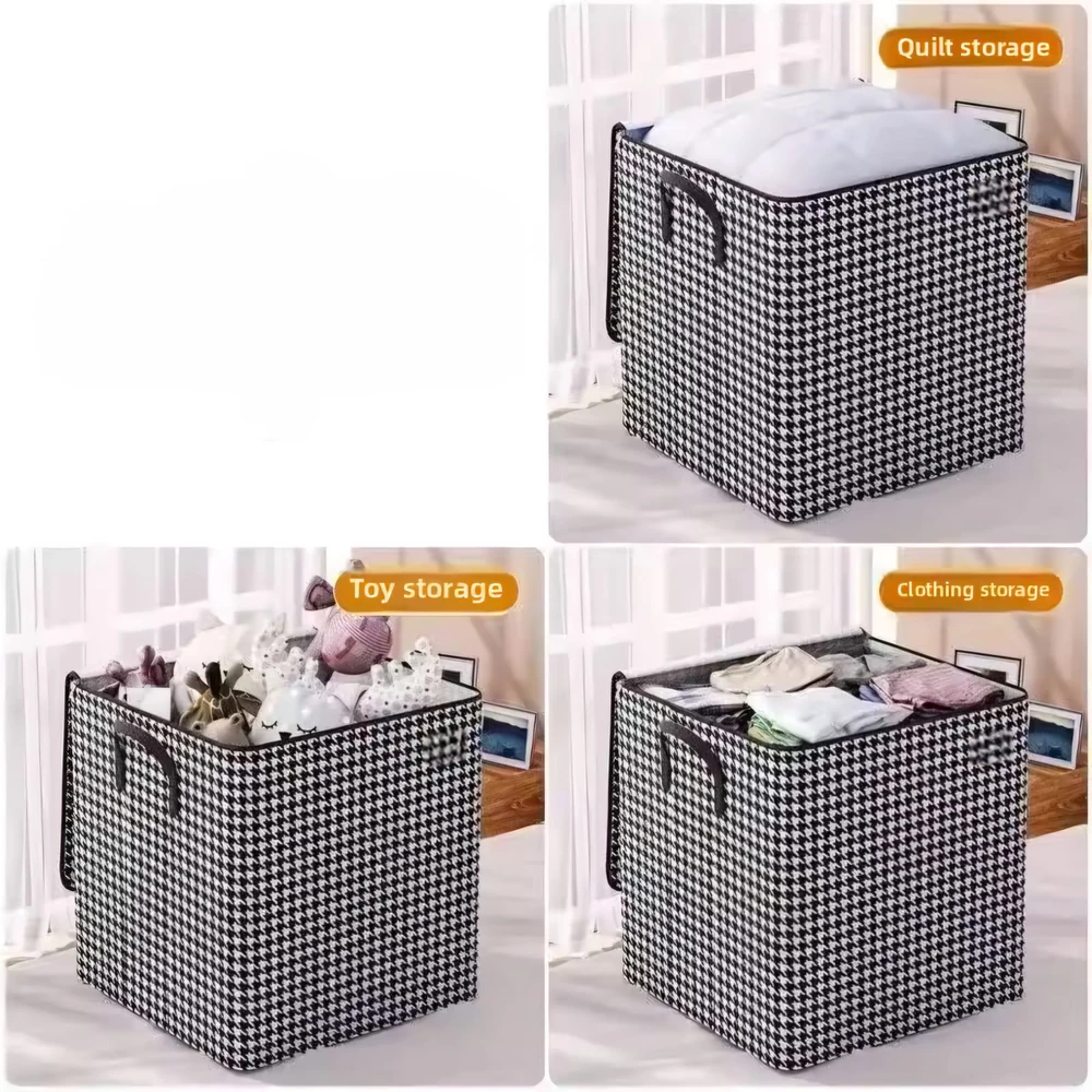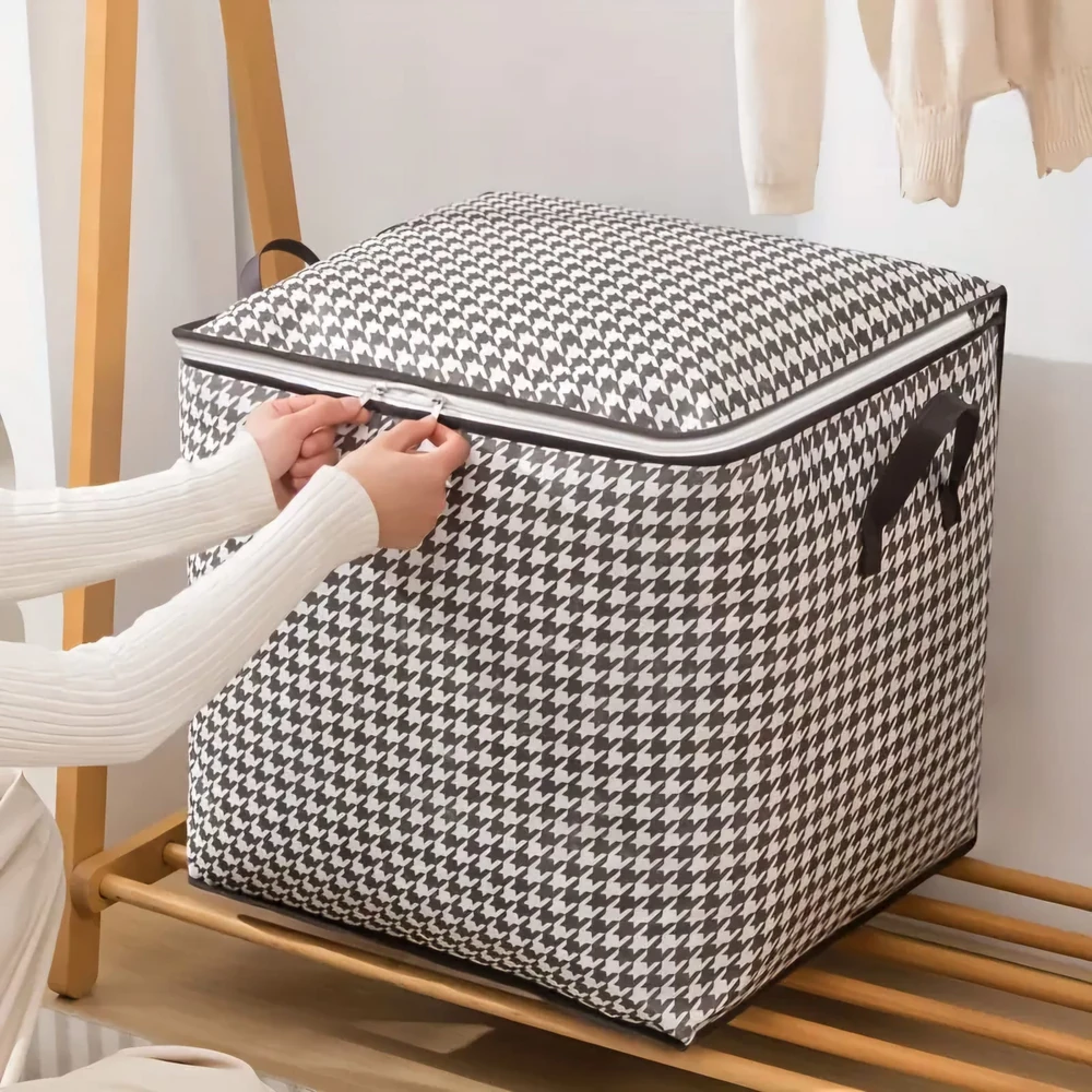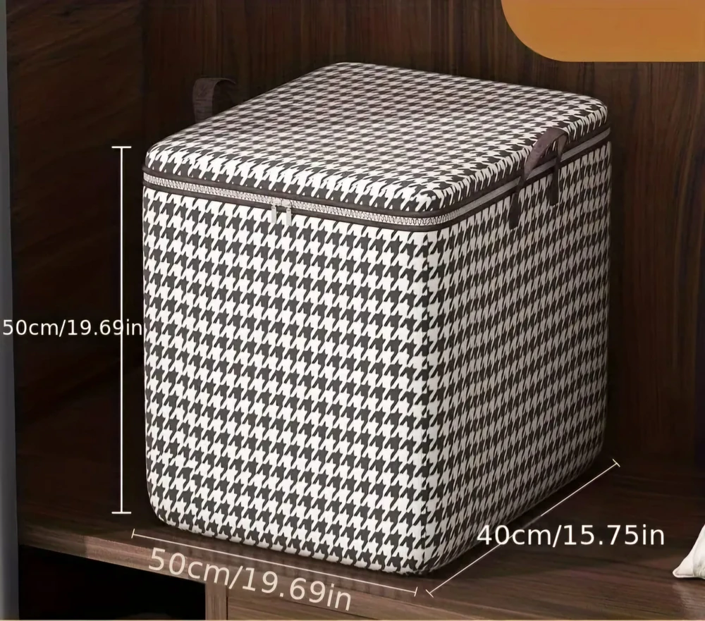 (Canasto de almacenamiento plegable, utilizado para guardar ropa, ropa de cama, o cualquier otro artículo que se desee proteger del polvo y la humedad. Su diseño plegable permite guardarlo fácilmente cuando no está en uso, ahorrando espacio. Además, su cierre asegura que el contenido se mantenga seguro y protegido).